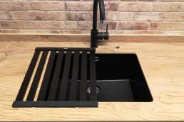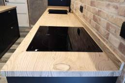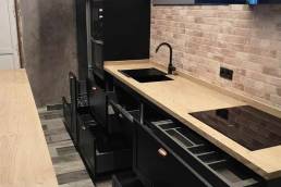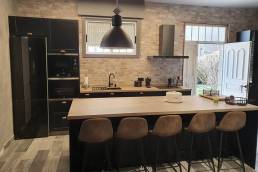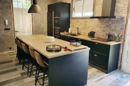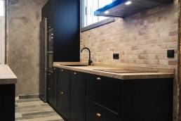 Cocina equipiada con puertas modelo Genil Lacadas negro mate con tirador   tirador vintage cobrizo. Encimera porcelánica Neolith La Boheme con textura madera con canto regruesado.