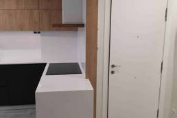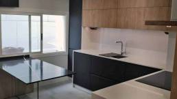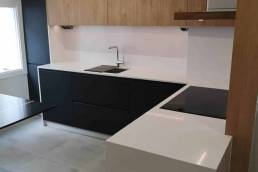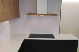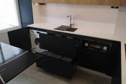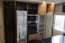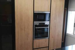 Equipamiento de cocina con puerta laminado negro antihuellas en combinación con puerta de roble croata. Encimera Silestone Blanco Zeus y mesa Silestone Ethernal Noir.